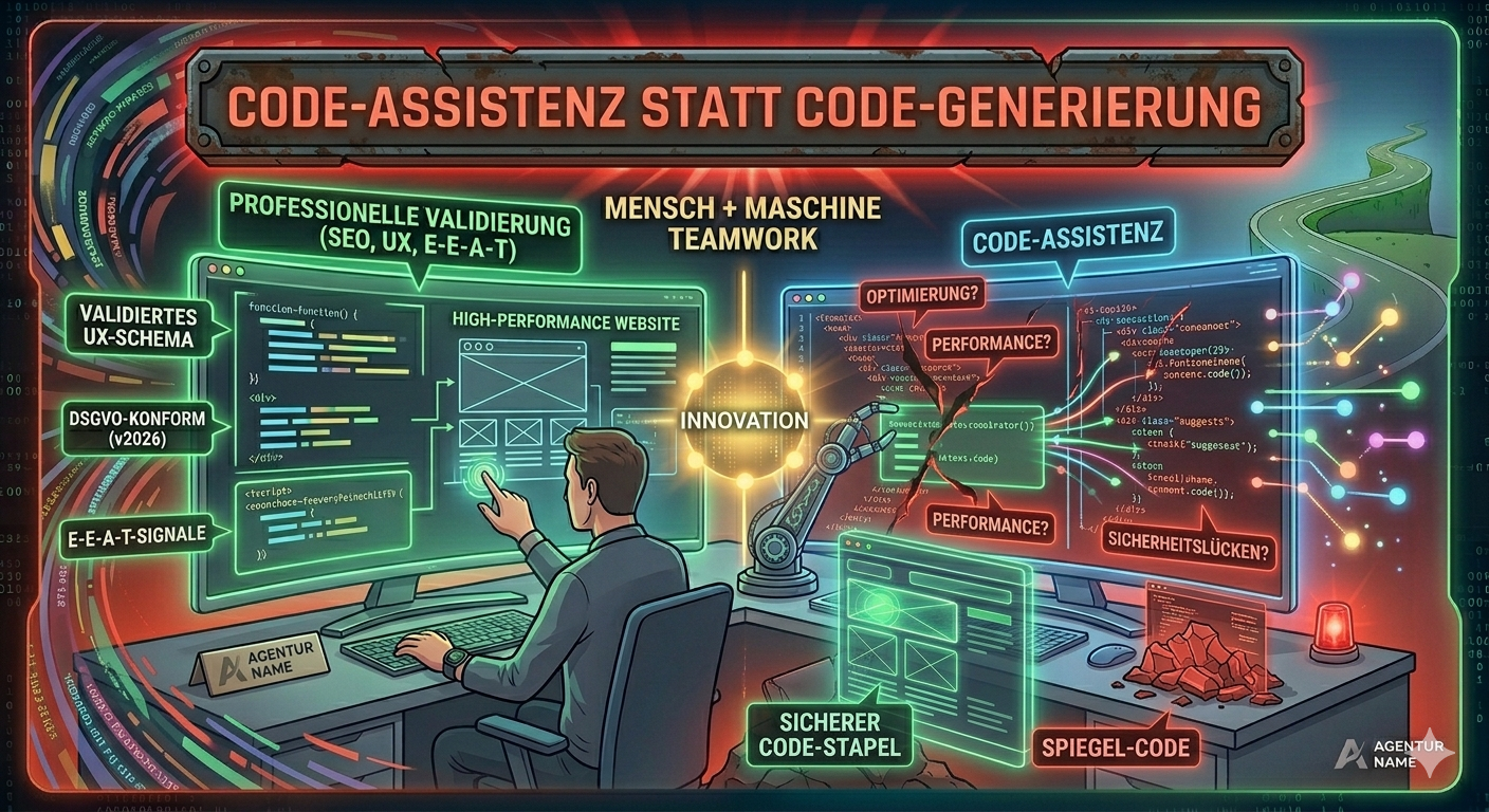 - Menschliche Kontrolle: Die KI schreibt Vorschläge, aber wir als Entwickler prüfen jede Zeile auf Sicherheit, Performance und DSGVO-Konformität.
